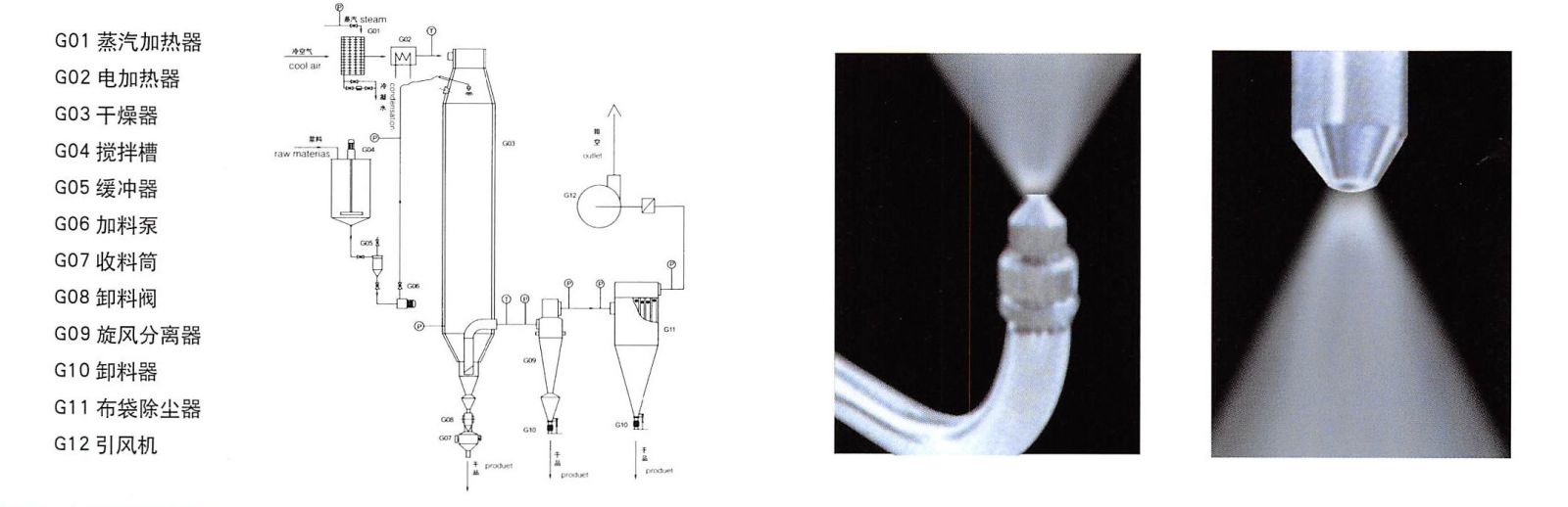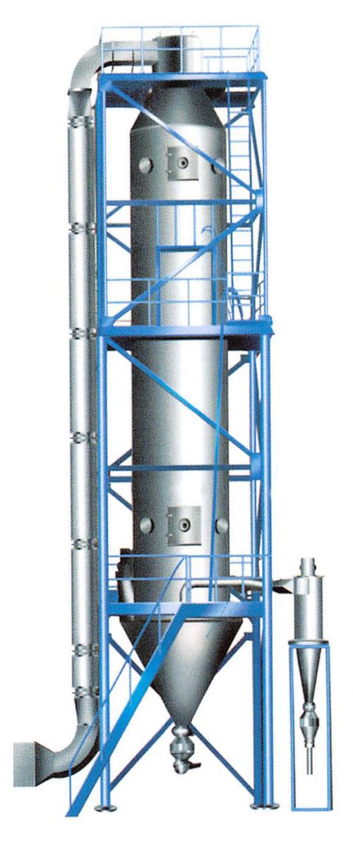 本機(jī)組工作過(guò)程中為:料液通過(guò)供料泵均勻輸入,噴出由壓縮空氣霧化成霧狀液滴,然后同熱空氣并流下降,大部分粉粒由塔底排料口收集,廢氣及其微小粉末經(jīng)旋風(fēng)分離器分離,廢氣由排風(fēng)機(jī)排出,粉末由設(shè)在旋風(fēng)分離器下端的收粉筒收集,風(fēng)機(jī)出口處還可裝備二級(jí)裝置,回收率在96-98%以上。