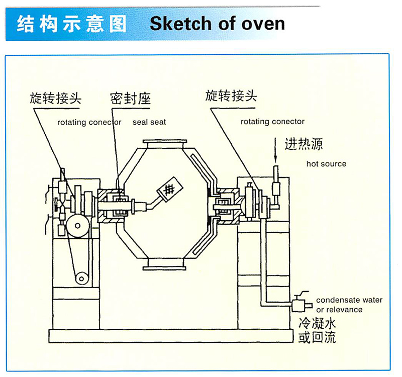 ※ 在動(dòng)力驅(qū)動(dòng)下,罐體作緩慢旋轉(zhuǎn),罐內(nèi)物料不斷地混合,從而達(dá)到強(qiáng)化干燥的目的。