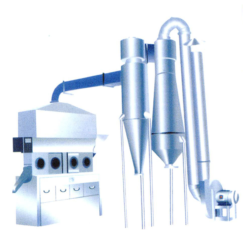 ※ 沸騰干燥器,又稱流化床,它是由空氣過濾器、沸騰床主機、旋風分離器、布袋除塵器、高壓離心通風機、操作臺組成。由于被干燥物料的性質不同,配套除塵設備時,可按需要進行,可同時選擇旋風分離器、布袋除塵器,也可選擇其中一種。一般來說,比重較大時的物料只需要選擇旋風分離器,比重較輕、較細的物料需配套布袋除塵器,并備有氣力送料裝置供選擇。
