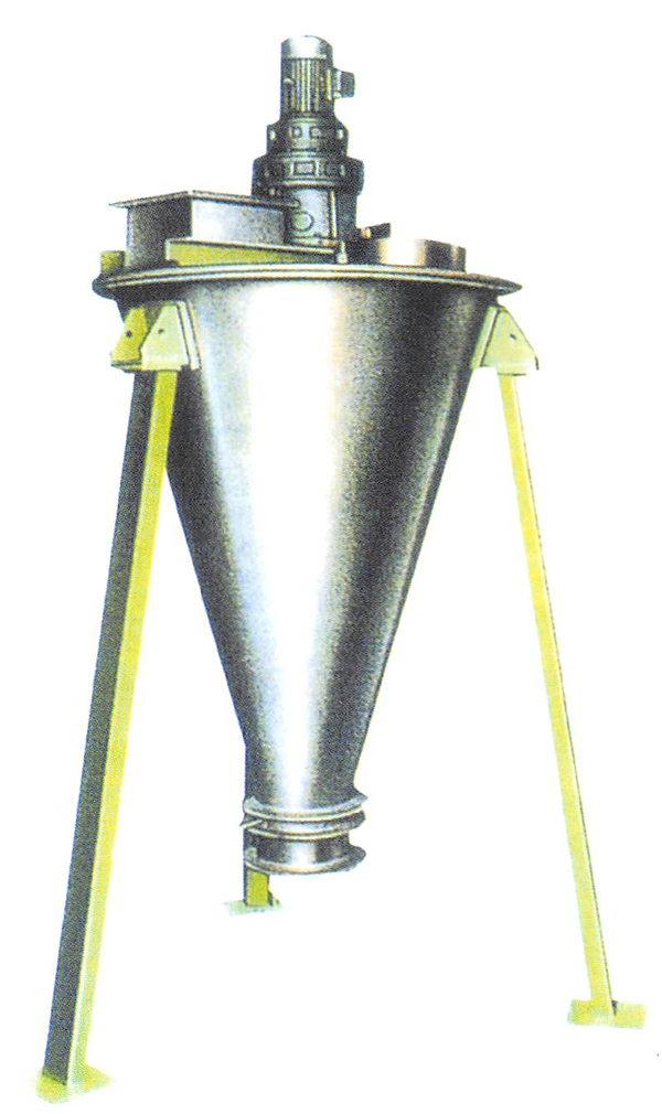 (1)、螺旋沿壁公轉(zhuǎn),使物料沿錐壁作圓周運(yùn)動(dòng);